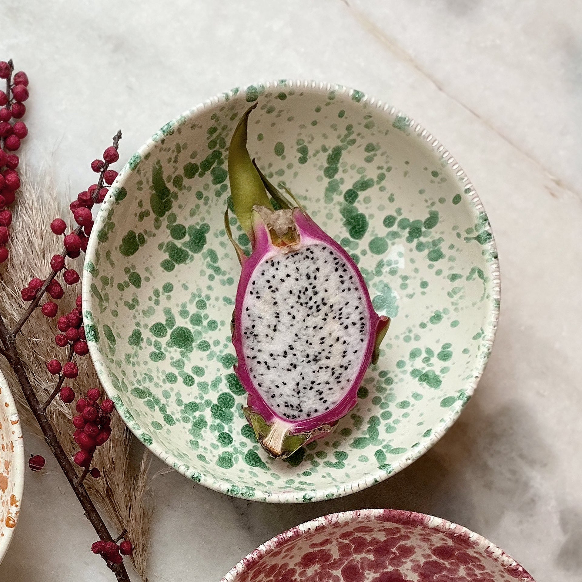 The distinctive “splatter” design originates from Puglia – also known as the “heel of Italy’s boot”. Handmade and painted by a ceramics artisan who has produced pieces in the same town for 18 generations, this means no one is the same and your item is truly unique. Available in a blueberry, pistachio, burnt orange, or cranberry splatter.